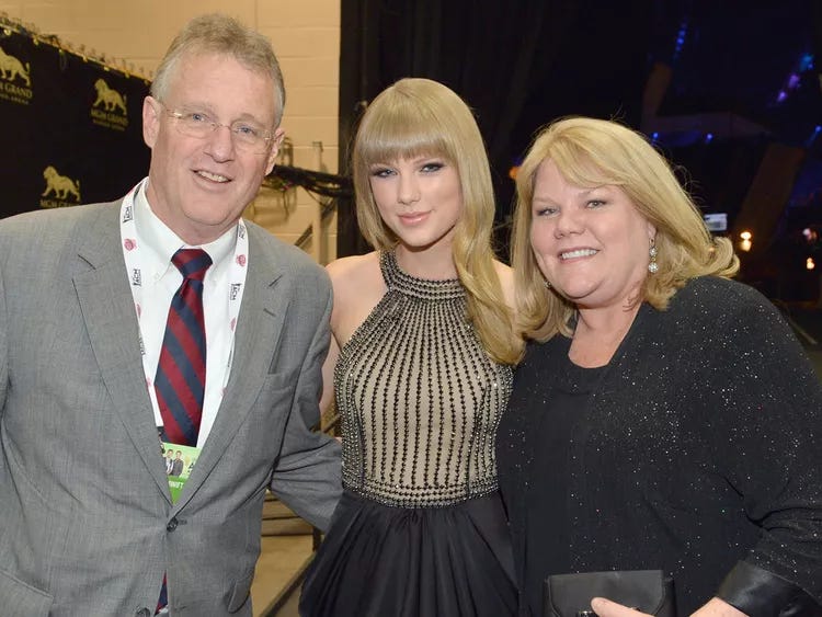 The first thing that pops out about Taylor Swift (her mom named her “Taylor” so she would have a non-genderized name, apparently to give her some kind of advantage?), is how much her parents “helped” her career. I finger-quoted “helped” because this isn’t the normal version of parental “help”, like when your mom bakes cookies for the school bake-sale, or your dad coaches the 12-and-under soccer team.
